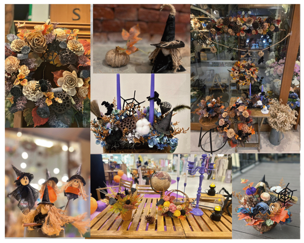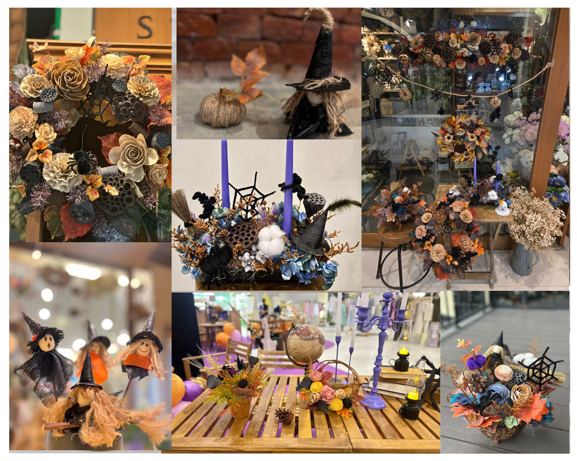 - 🎃 ソラフラワーアレンジメント、リース、スワッグ:ハロウィンカラーで雰囲気づくり、箒,カボチャ、お化け、コウモリなどの手作り装飾品を施して楽しく華やかなデザイン
